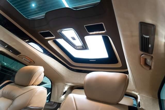 我们来到了乘客的第三排,三排座椅424,从此人生没烦事!我们可以看到424单独调节的座椅呢,相互之间是完全不影响的,同时我们座椅还带通风按摩加热,有区别于普通的一体沙发床哦,全新的飞船顶灯设计,外形非常的时尚酷炫,搭配了迈巴赫顶部的一个化妆镜,女士在车内随时补妆。