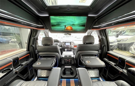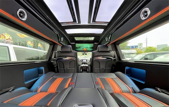 两个独立的航空头等舱按摩座椅,配有通风、加热、按摩等十二项电动调节功能,让我们在乘坐过程中有舒适的乘坐体验。顶部半隔断的车载无线网络电视机,全车10个进口BO音响系统,再配合顶部天窗和后部的三色宫格顶灯相结合,搭配整车的线条式氛围灯,凸显整车的层次感,也烘托了整体的氛围。