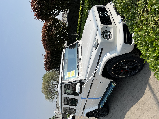 22款奔驰AMG G63 (配置|询价)白色现车它硬朗的方盒子造型,没有多余的弧度、没有任何曲线,眼光所及满是平直锋利的线条,就连车顶上的导雨沟槽,也是沿着车顶周围一圈,分外焊接上去的金属槽,车门搭钮更是绝不虚 心,硬挺挺 地屹立在 门缝之外,外凸 的轮拱、造 型如同 梯形的引擎盖。