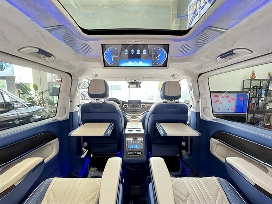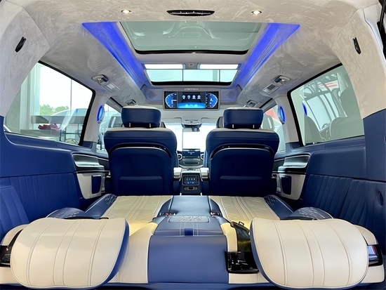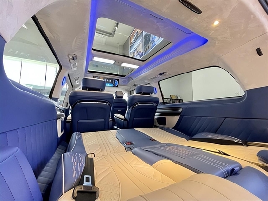 地板采用柚木地板上铺星光棉绒地毯搭配金属压边更显品质;音响罩以元素增加节奏变化,使得整车顶部更富设计感及肌理感;内顶立柱灯以乐章元素为外形,雕刻花纹,车内氛围灯及照明灯均设计了亮度明暗调节功能,满足不同用户对照明的需求;两面全景天窗保障车内通透敞亮。半隔断电视搭配音响系统给我们带来极致的试听感受!