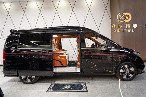 这款车基于奔驰的V260加长版定制,采用高顶设计,前脸使用上一代迈巴赫同款造型的包围套件呈现出一种高端、大气、威严的视觉感。整车尺寸5400mm*1928mm*2010mm,搭载的2.0T涡轮增压发动机,功率155kw扭矩350n.m。可调空气悬挂系统让你乘坐更加舒适,而且车辆的通过性更高。流线型的造型的车顶与原车线条搭配得十分融洽,晓奥独有的红黑腰线+AM标识使得这款车的辨识度非常的高。五辐双色轮毂不仅美观还方便清洗,不至于在临时接待客户前花费太多时间去清洁。
