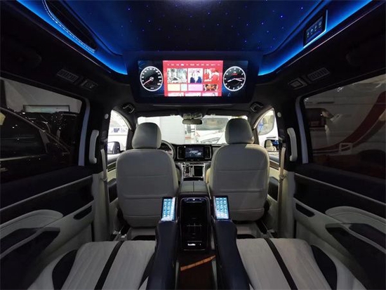 内部采用蓝色和白色的超纤真皮双拼设计,舒适度和观赏性都是极高的,腰线以上采用的则是高级麂皮绒的包覆,做工非常精细讲究,全车隔音降噪,健康舒适的驾乘环境,后舱独立车载电视带影音系统搭配8.1立体环绕音响,让您在车内就可享受院线级影音系统,