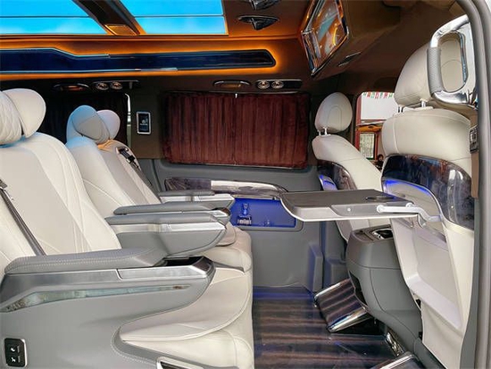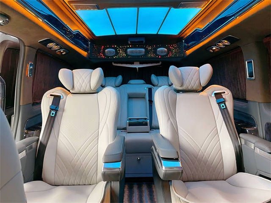 顶部搭配层次分明的光纤灯,配上繁星点点的满天星和横条灯带,即梦幻又高级。一切的搭配都只是为您展示这款奔驰威霆巴赫版的奢华与不凡。同时本款威霆高顶7座高端私人定制改装商务车,不仅在视觉上还是触觉上都能让乘坐着感到身心愉悦。奔驰威霆升级后的第三排是七座车型的第三排电动沙发座椅,支持180°放平,随时为您的长途出行打造足够宽敞舒适的卧铺,威霆车内简约时尚的氛围灯与豪华马毛地板交相辉映,是对精致移动生活的奢华追求。