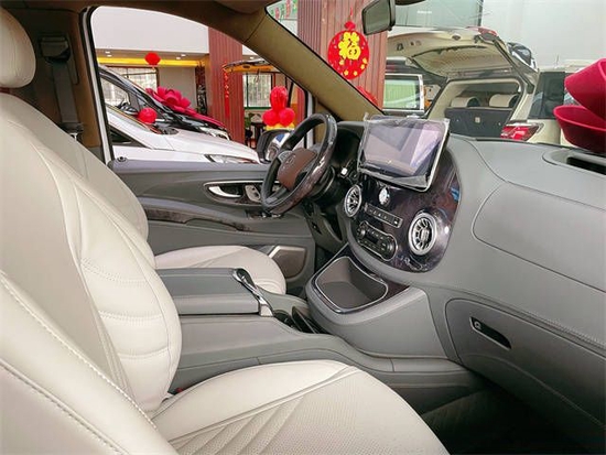 奔驰威霆的内饰更具有豪华感,采用真皮包裹的三辐式多功能方向盘,炮筒式机械仪表盘更加高档,配备了悬浮式液晶屏,多媒体的按键排列集中整洁,中控台大面积的木纹装饰板都验证其家族属性。座椅采用人体工程学设计,能给我们带来更好的乘坐舒适感,座椅具有加热、通风、气动按摩,一键腿托、腰托、头枕调节,并且还具有记忆功能,完全给我们带来头等舱的舒适体验。后排乘客既使在长途的行驶途中也能够完全放松,仅需按下操控按键即可享受最佳的躺座姿势,以及舒适的睡眠效果。