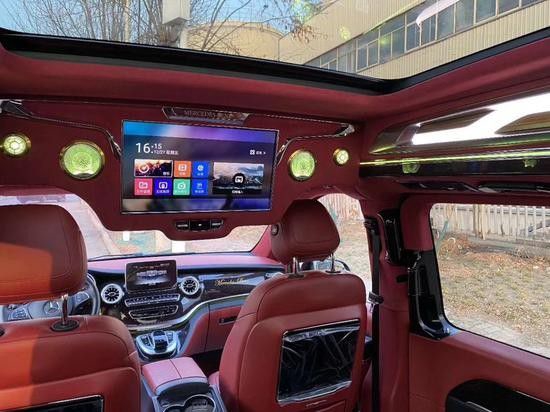 进入后舱这款奔驰V250采用的是前后排隔断的处理方式,更好的为大家提供隐秘性并且大大提升了后排的娱乐体验。隔断采用的是32寸曲面屏电视后排的乘客可以通过隔断下方的中央操控面板控制的电视升降和车内灯光的调节。如果需要跟前排的驾驶员沟通您可以把隔断放下跟驾驶员有更好的沟通环境,包括隔断下方的镀装饰大大的提升了车内的豪华感。