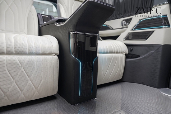 奔驰V260L傲旋大白鲨增加香槟架和折叠隐藏式航空铝制小桌台的功能,为商务洽谈和合同签订提供了更大的专业和便捷。