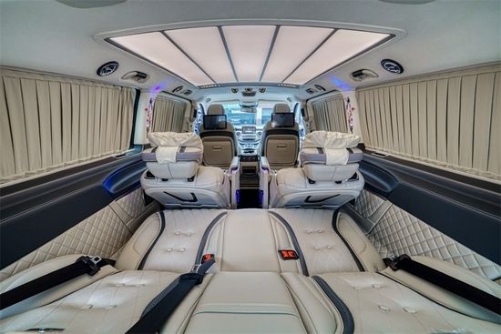 窗帘采用了手动高档进口窗帘,第三排座椅可一键放倒成沙发床,老人的休息圣地,小朋友的娱乐天堂,顶灯采用了最新奔驰豪华顶棚