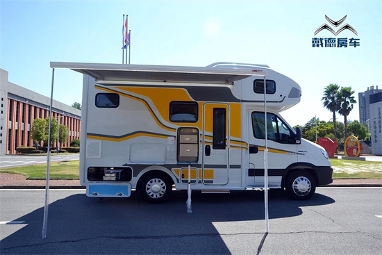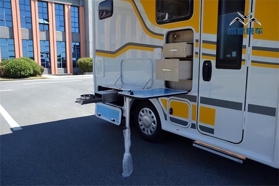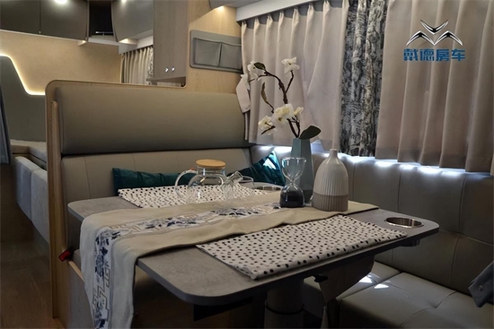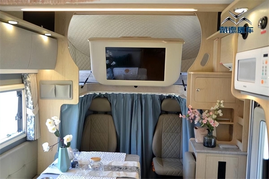 自由风这款车的室内布局比较常规,部分细节延续了戴德其他车型的设计元素。新车生活区采用了纵置床布局,会客区为L型卡座沙发,整体空间利用率较高,并采用了轻量化环保家具板材。驾驶室上方配备了32英寸小米智能互联网电视,翻板两侧带有液压支杆,将车载电视放下即为额头双人床。小米智能电视支持网上播放,影视资源丰富。额头双人床尺寸为2140×1500(mm),床位的两侧均配备了外推窗,四周墙体还使用软质材料包裹。额头床的最大垂直空间为约70公分。额头床的两侧均配备有可调节角度的金属阅读灯。
