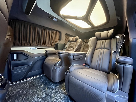 时尚内饰装饰,隐私布艺窗帘,采用高级皮革+麂皮绒包覆车壁,奢华的LED天幕顶灯,车载互联网电视,保真音响,支持私人定制和选配升级改装。
