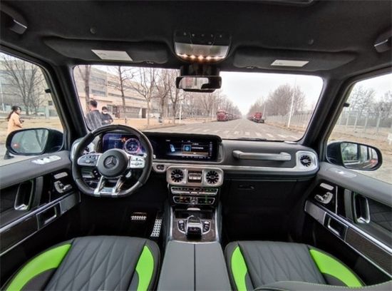 新款奔驰G63保留了新G500 (配置|询价)(配置|询价)的整体设计,除配色差异外,新车还换装了全新造型的平底式运动方向盘,其两侧配以打孔皮质包裹,下部镀铬装饰的造型也与新G500明显不同,看上去十分战斗。此外,全液晶仪表盘+中控大屏的双12.3英寸屏幕设计在新车上也没有缺席,营造出了浓郁的科技感。