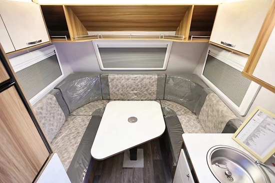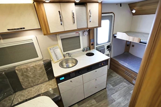 布局内饰方面,家具选用原木纹理的环保板材,餐桌及厨房台面则为白色仿大理石纹路板材,整体给人的感觉比较居家放松。T553是后上门的设计,进入车内首先是车尾的上下铺,车厢中部厨房和独立卫生间对立布置,车头区域既是客厅晚上也能变成双人床,整车可以舒适住下4人。