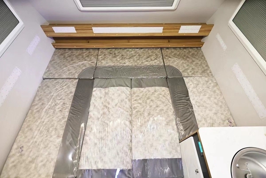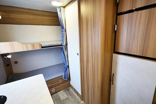 最后来到车尾卧室区域,这里采用双层床铺的设计,上铺床板还可以向上翻转锁定,即使上铺闲置的情况下,也不会影响下铺的垂直空间。