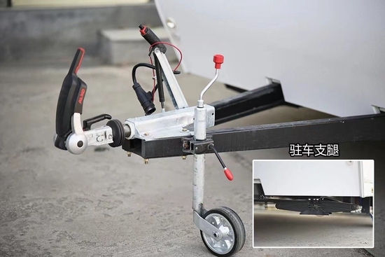 这款T553采用亚特重工自主研发的700Mpa高强钢车架打造,配套德国爱科1.5吨扭力轴,进一步提升行驶安全性可选装爱科AKS 3004摇摆稳定器。底盘四周安装有手动驻车支腿,停车露营的时候起到支撑车体的作用。整车的尺寸为5.5×2.3×2.6(米),整备质量1.36吨。