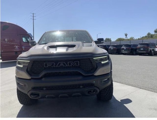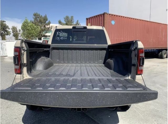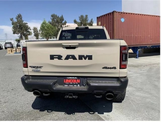22款道奇公羊霸王龙TRX国六最新款新车传承了道奇Ram家族高大威猛的造型设计,同时细节部分融入了更多高性能元素,包括经过黑化处理的前格栅,引擎盖两侧的黑色进气口以及为了容纳巨大的机械增压器而设计的通风口等等。此外,新车还配备了视觉冲击力更强的黑色轮眉和外露式的拖车钩,看上去十分霸气。