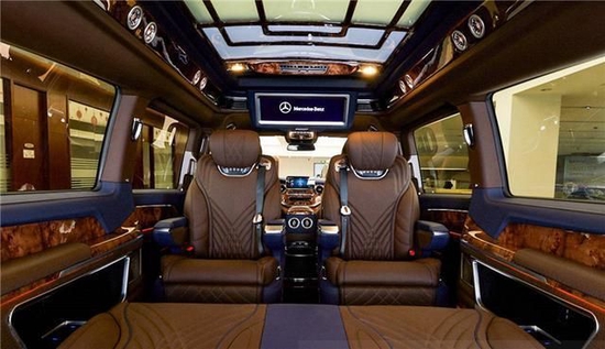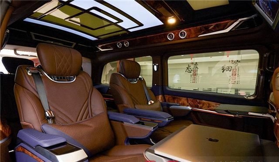 车顶部采用麂皮绒完美包覆,顶棚和侧壁都采取星空元素的设计,当车内顶灯开启之后,打造出置身星河的感觉,在这样的氛围当中,身心都得到了释放。定制的航空座椅,采用小牛皮纯手工包裹,独特的菱形纹路和线条相互搭配的设计,不仅仅增加美感,让身处其中时带来无限的舒适感。座椅具有多种电动调节功能,在一键操作下,可以完成按摩,加热,通风和脚托等多项功能,在旅途当中,可以随时释放身心的疲倦感受。