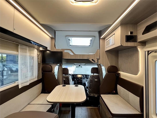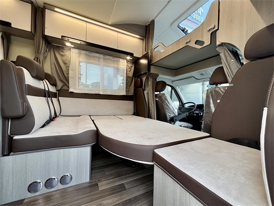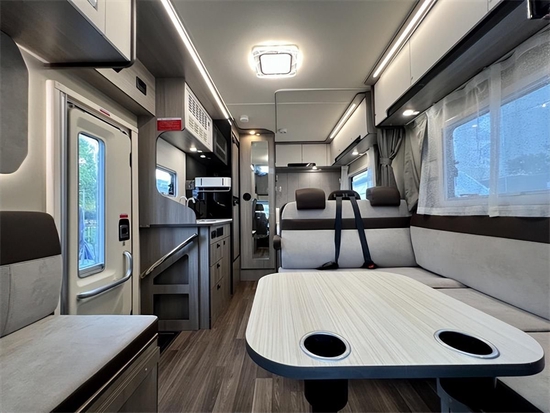 进入车内,科技灰环保板材与米白色内饰搭配,为车内营造出居家般的生活感,空间虽不及拓展房车,但L型卡座会客区、前额头床、中央厨房、后子母床(或者后纵床)及一体式卫生间等生活配置一应俱全,同时整车外推窗均配备有私密拉帘,有效保障旅途中的隐私。
