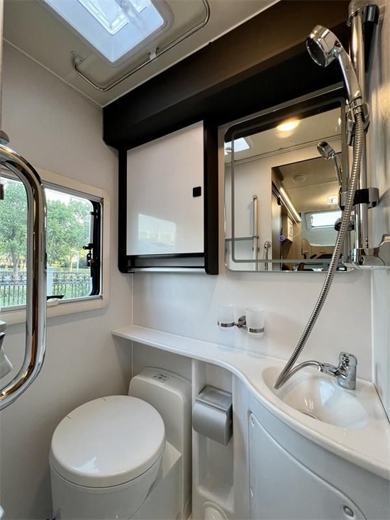厨房区位于会客厅的对面。配备志高电磁炉及不锈钢洗手池等;上方和下方均设计有多组储物柜,储物空间丰富;周围一组220V电源插座可为手机等小型电器充电。房车旅行最重要的一点就是舒适性,车内宽敞的空间是必不可少的。C530大玩家定制版房车车内空间很大,整体布局很合理,驾驶室、卧室区、客厅、卫生间、厨房等功能区一应俱全。