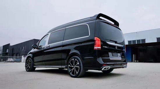 侧面的整体造型和原车对比差异还是很大,我们从上往下说,首先增加了车窗周边的镀铬饰条其次是下方的迎宾舱脚踏板,因为22款奔驰V级 商务车,全系增加了空气悬挂,所以底盘可根据驾驶模式及手动调节,车身姿态的高低