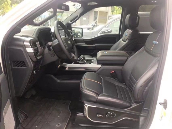 2021款福特F150车内配备标准独特的皮革和布艺装饰的座椅,驾驶员侧的电动十向调节。这些座椅同时具备记忆功能。中央控制区搭配了触控式显示屏,其下方则是多媒体控制区及空调面板,采用旋钮+物理按键的组合。中控功能区域可分为三个小控制区,最上端为音响控制及导航控制,中间为收音机调节控制,最低端为空调及座椅加热控制。