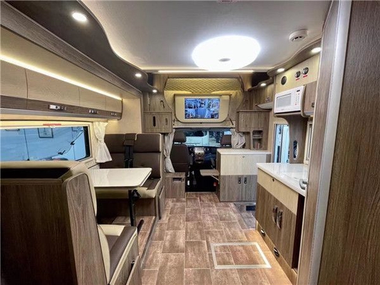 车内采用中式的家居风格,符合大多数人的审美,会客厅部分采用的是对座式沙发卡座的设计,直径达到了1.95m,即便两个成年人对立而坐也不会碰腿。车内储物空间由会客厅上方4组吊柜,后尾部3组,沙发卡座下方储物空间,尾部贯穿式储物仓大概拥有2500L的储物空间可供使用。