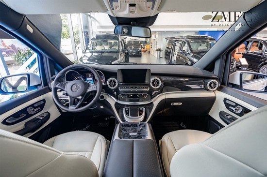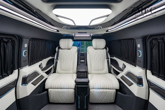 奔驰V260L傲旋大白鲨增加香槟架和折叠隐藏式航空铝制小桌台的功能,为商务洽谈和合同签订提供了更大的专业和便捷。