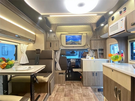 车内采用中式的家居风格,棕色木纹加米色木纹的装饰,沉稳内敛符合大多数人的审美风格,额头区配有电视以及额头床方便我们娱乐的同时又提供休息区域;