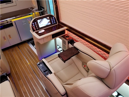 丰田考斯特在改装方面更加注重商务旅行中办公的实用性。车内的真皮航空座椅,电动调节装置可以让您自行调节最舒适的空间距离、靠背以及脚托的角度,特殊的座椅构造,增加腰部的支撑,宽敞的空间让您的双腿收放自如,忘却旅途的紧迫感,体验如家般的感觉,缓解您在行车旅途中的疲劳。丰田考斯特改装商务车内饰增加豪华高档办公桌以桃木及真皮为材料,打造最舒适高端使用的办公环境。