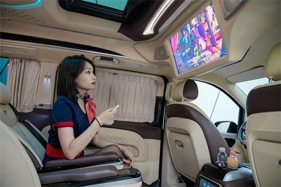 进入车内,顶部悬挂21.5英寸智能显示器、网络电视、屏幕投影和第三方连接播放多种用途选择。多功能触摸屏、中排成员可自由快速调节车内照明、三色氛围灯、电视、空气净化器等。