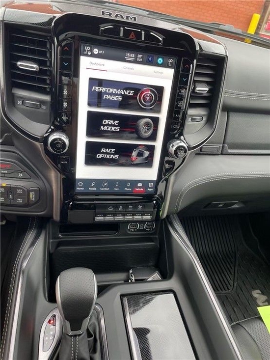 道奇霸王龙内饰部分进一步强化了其高性能版本的形象,中控台和座椅随处可见的TRX标识便是最好的例证。同时,作为道奇Ram家族的旗舰车型,新车还配备了12英寸竖置中控屏幕,除了支持蓝牙、导航和车载Wi-Fi等常见功能,还支持Apple CarPlay和Android Auto手机映射。