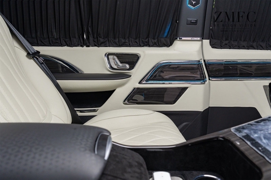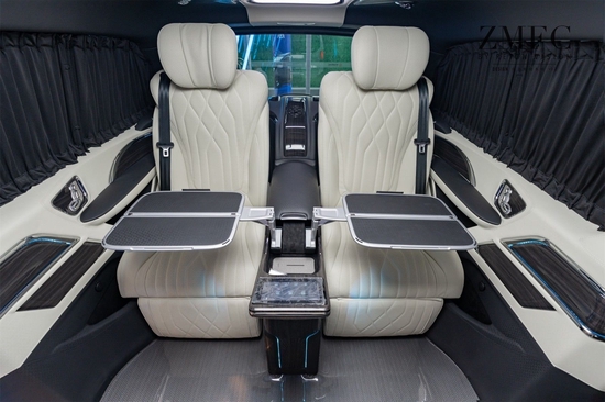 奔驰V260L傲旋大白鲨增加香槟架和折叠隐藏式航空铝制小桌台的功能,为商务洽谈和合同签订提供了更大的专业和便捷。