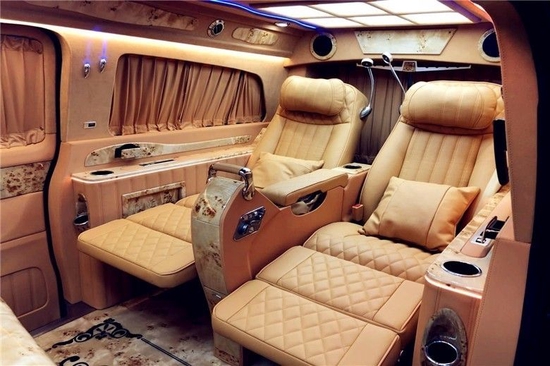 迈巴赫VS980改装迈巴赫版VS980商务车后舱为三连沙发座椅,迈巴赫VS980迈巴赫VS980车在一键放平成床之后,就可成为你的旅行床,燥热、无 聊之时,与家人朋友郊外旅行,在这张床中休息、畅聊都是您避暑的好方法。