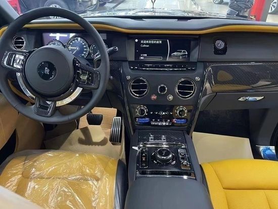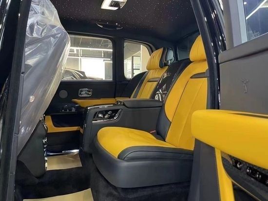 在Black Badge库里南中,奢华真皮座椅上的星空顶,作为新增的柔和光源,强化了车内的氛围。黑色真皮配合1344根独立光纤手工编织其中,绝妙还原了夜晚的星空。八颗绚丽的白色流星随机地在车顶划过,前排乘客的头顶出现流星的概率更大,十分巧妙地体现出这辆车对喜爱自主驾驶的客户的吸引力。劳斯莱斯库里南Black Badge的内饰换上了高科技的裸织工艺制成的材料,同时增加了全新的色彩,亮黄色的全真皮装饰。另外在后排座椅扶手上,发光脚垫上和时钟边框上都有个性化“无限符号”,大幅提升了整车的极致豪华感。