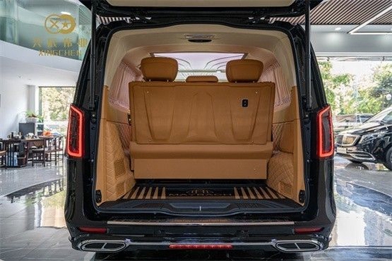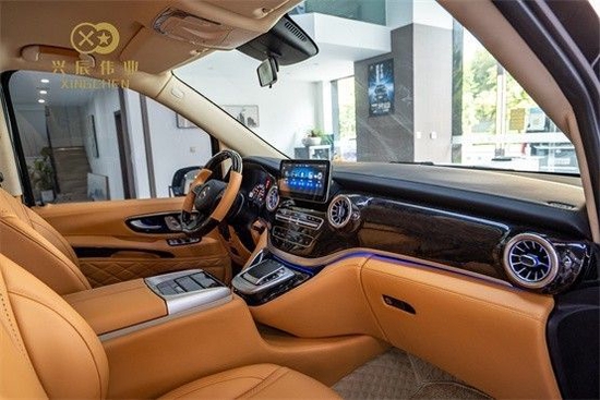 全车采用纳帕真皮。新款9AT的变速箱,标配了空气悬挂,带来了更加平稳顺滑的驾驶感受。奔驰v260 (配置|询价)商务车的方向盘,中控 应用檀木装饰,完善整车档次;豪华中央扶手,对开式储物箱顶盖设计,内置冰箱设计。
