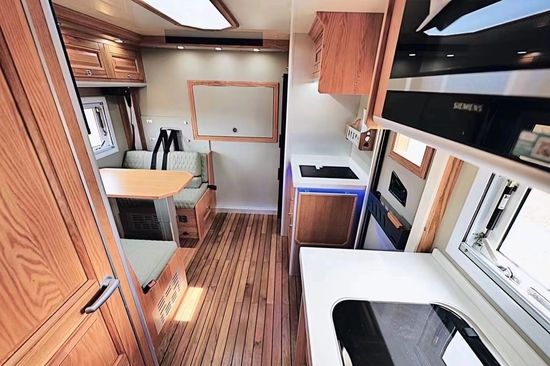 厨房区实木组合式橱柜采用分区域布局设计,由乘客门隔开,不同的功能相互呼应的同时也让做饭井然有序,橱柜推拉式抽屉便于存放日常生活用品及碗具。其它方面配备触摸式集中控制系统+机械式翘板开关、液晶电视、小米盒子、日本YAMAHA八喇叭音响系统(带低音炮)、抽油烟机、微波炉、西门子电磁炉、152L赛特福德房车专用冰箱、大宇3kg洗衣机、特鲁马燃油暖风热水一体机、四路监控、一氧化碳/烟雾报警器等。室内多个220V、12V电源插座及USB充电接口可满足日常充电需求。