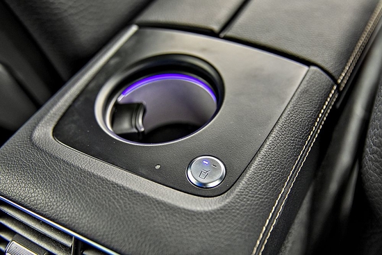 推开实木隔板,在地台上有一个无线充电面板以及可冷热的杯架,这里还有两个Type-C接口,值得说明一下,GLS将车内外部接口全部更新至Type-C接口,所以如果您是USB先需要转接。