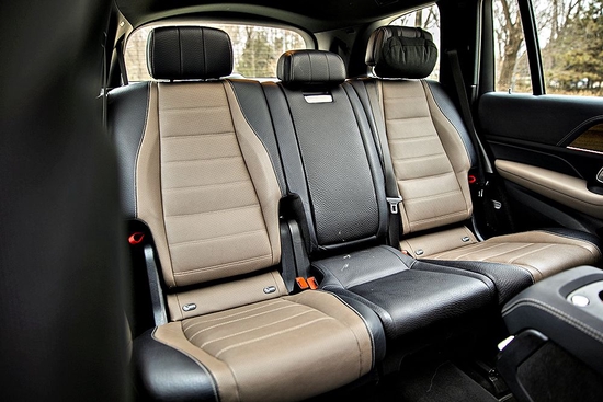 第二排座椅同样宽大舒服,但是中央区域稍硬,乘坐体感不如两侧座椅。第二排座椅支持电动调节前后距离以及靠背角度,另外GLS座椅还支持“EASY-ENTRY”系统,可以一键自动收折,回复原位需要长按。