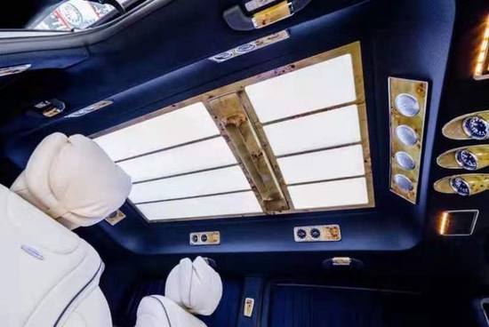 奔驰V260圣母峰现车奔驰平顶商务车圣母峰全车地毯及窗帘均采用了进口的羊绒材质,踏感享受十足。 奔驰高顶商务车圣母峰车顶采用大面积的LED顶灯,保证了车内的充足照明,后舱玻璃处均配备了隐私窗帘,