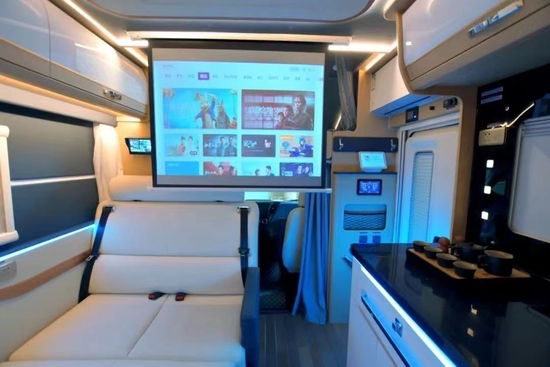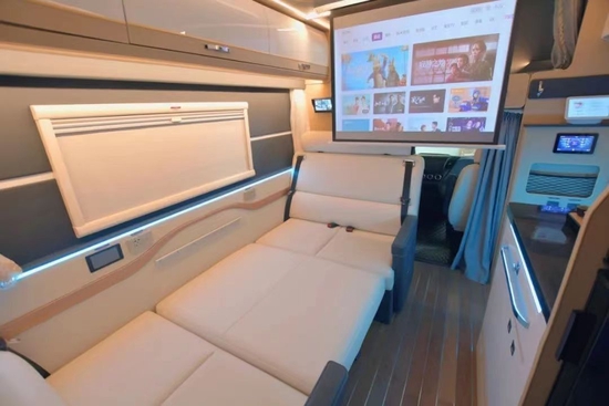 会客区座椅可通过简单的操作,拼出一张长达1.8m的大床,躺在这里看电影,格外惬意舒适,作为床铺的体验也远超普通的沙发床。车内的唯一固定大床则是驾驶区上方的额头床了,所以别看没有后置的床铺,整车的休息区空间还是很够用的。