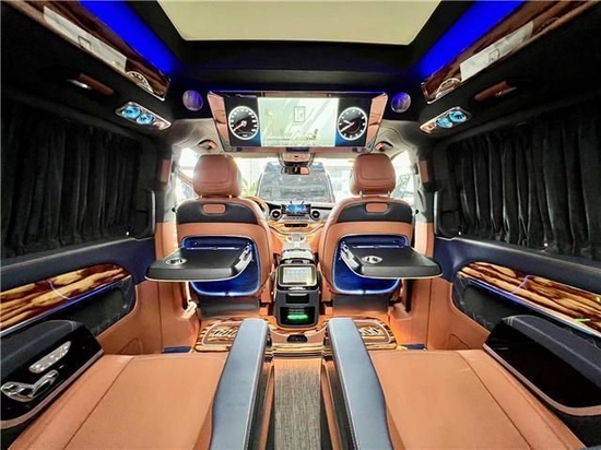 立体环绕的音响系统,半隔断高清互联网液晶电视,两侧个性化定制的侧墙在车内进行商务洽谈也不会显得沉闷。背部独立办公小桌板还支持手机无线充电,方便快捷;全车采用麂皮绒包覆与高光镜面钢琴烤漆的实木搭配,大气又奢华。