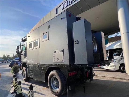 卫生间采用干湿一体式设计,内部配备赛特福德马桶、洗手池、梳妆镜、换气扇、淋浴花洒等;大宇3kg洗衣机免去了手洗的时间,提高了生活效率;水路系统方面,400升净水箱、75升灰水箱。整车上下水系统做了防冻处理,更好的适应极度严寒等恶劣环境。