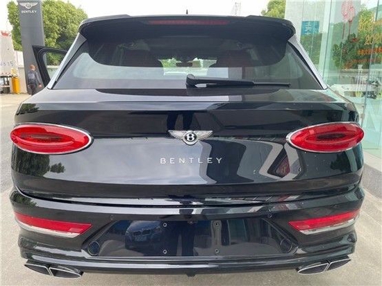 22款宾利添越车尾部分,新款添越使用了宾利最新家族式的尾部设计,整体看上去十分简洁、椭圆形尾灯犹如两颗珠宝,十分璀璨。双边共四出的排气,标志着新款宾利添越依然有着十分强悍的性能。