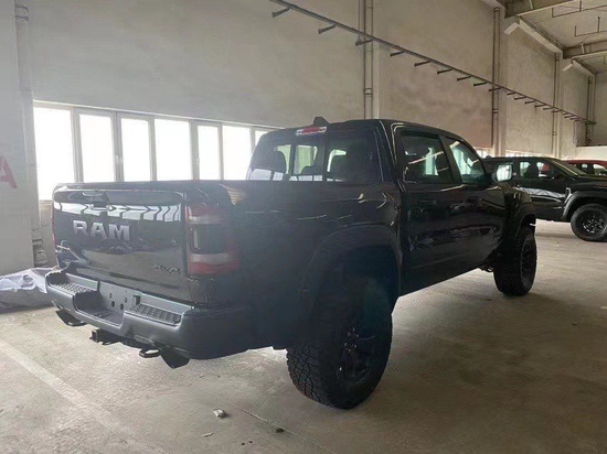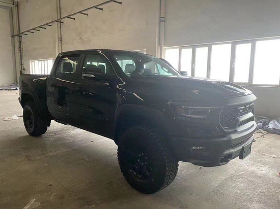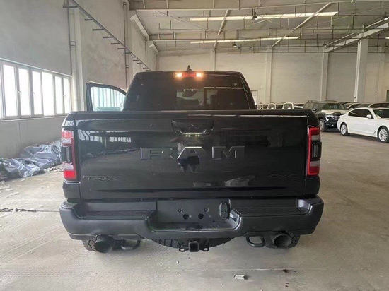 22款道奇公羊霸王龙TRX国六最新款新车传承了道奇Ram家族高大威猛的造型设计,同时细节部分融入了更多高性能元素,包括经过黑化处理的前格栅,引擎盖两侧的黑色进气口,霸王龙 以及为了容纳巨大的机械增压器而设计的通风口等等。