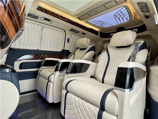 后舱二排座椅进行旋转,可以与第三排沙发座椅形成一个对卡座布局,瞬间形成移动办公室为我们切换到商务谈判模式。第三排座椅支持180平成床,为我们提供舒适的休息空间。本款奔驰V260L商务车的顶灯部分运用的是迈巴赫圆弧形顶灯设计,材质采用美国进口石英水晶,通过镶嵌式总控进行控制,三色可变,营造出舒适氛围。