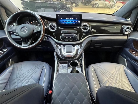 驾驶室整体换装也是比较大的,奔驰V级 (配置|询价)的悬浮式中控,迈巴赫涡轮出风口,具有非常高的豪华感,这款车主副驾驶座椅升级多项电动调节与加热功能,可任意调控的温度的车载冰箱,真皮包覆的中控台与奔驰钟表,彰显了这款奔驰威霆的独特设计与尊贵感。