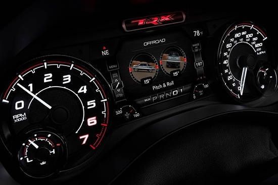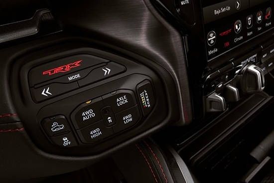 22款道奇公羊RAM霸王龙在内饰部分进一步强化了其高性能版本的形象,中控台和座椅随处可见的TRX标识便是最好的例证。同时,作为道奇家族的旗舰车型,新车还配备了12英寸竖置中控屏幕,除了支持蓝牙、导航和车载Wi-Fi等常见功能,还支持Apple CarPlay和Android Auto手机映射。