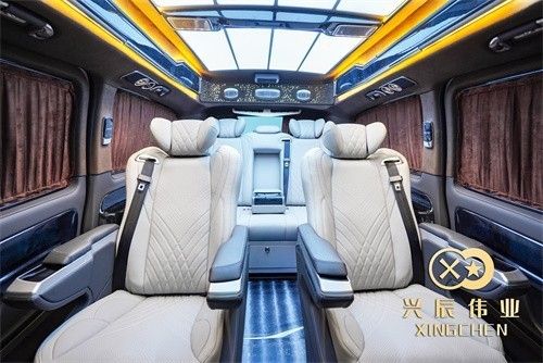 奔驰威霆商务车改装7座后排座椅支持180度平躺;为您的长途出行打造临时床铺奔驰威霆七座版改装商务车,七座车型的第三排沙发,支持一键放平或者收起,随时为您的长途出行打造足够宽敞舒适的卧铺,简约时尚的氛围灯与豪华柚木地板交相辉映,是对精致移动生活的皮质追求!