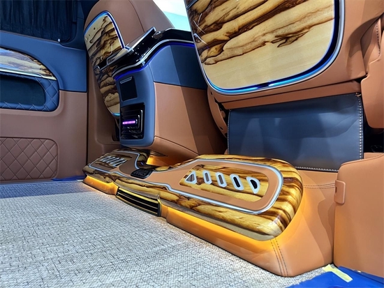 第三排活动空间本身就很宽阔;加上第二排座椅旋转形成的布局,完全就是一个豪华办公室,再加上立体环绕的音响系统,半隔断高清互联网液晶电视,两侧个性化定制的侧墙在车内进行商务洽谈也不会显得沉闷。最重要的是第三排还可以一键放平成一个豪华大沙发床,为车内人员提供一个非常舒适、私密的休息环境。