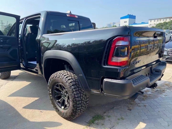 22款道奇公羊霸王龙TRX国六最新款新车传承了道奇Ram家族高大威猛的造型设计,同时细节部分融入了更多高性能元素,包括经过黑化处理的前格栅,引擎盖两侧的黑色进气口,霸王龙 以及为了容纳巨大的机械增压器而设计的通风口等等。此外,新车还配备了视觉冲击力更强的黑色轮眉和外露式的拖车钩,看上去十分霸气。
