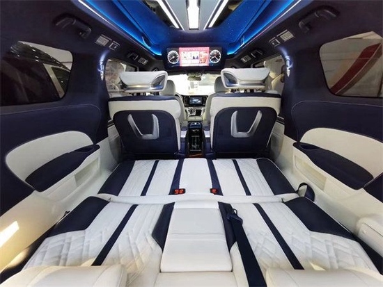 流线型高顶车内头部空间增加了11.5公分,使得车内空间更加宽阔舒适。顶棚采用极夜之光造型顶灯,搭配七彩满天星星空顶,真的是特别好看,入门处即有传祺专属定制的不锈钢脚踏板,以及手工铺垫的进口柚木地板,贵宾舱内饰采用时尚的蓝白双拼配色加高亮光定制装饰,NAPA工艺包覆加上桃木点缀,更加的有质感,顶棚也是采用了高级麂皮绒包覆。对于用材用料上,真是一点不手软啊,这手感必须点赞啊。