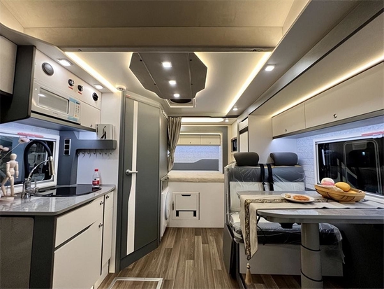 整车尺寸为5990×2490×3180mm,车厢内前部高度为2120mm,后部则是1930mm,核载6人。客厅区域桌面也做了延伸处理,增加了座椅数量,5孔电源、USB接口和纸巾盒等全部设计在桌面以上,方便操作,整车的插座数量也有提升。